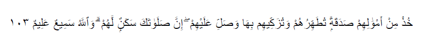 “Ambilah (sebahagian) dari harta mereka menjadi sedekah (zakat), supaya dengannya engkau membersihkan mereka (dari dosa) dan mensucikan mereka (dari akhlak yang buruk); dan doakanlah untuk mereka, kerana sesungguhnya doamu itu menjadi ketenteraman bagi mereka. Dan (ingatlah) Allah Maha Mendengar, lagi Maha Mengetahui.”